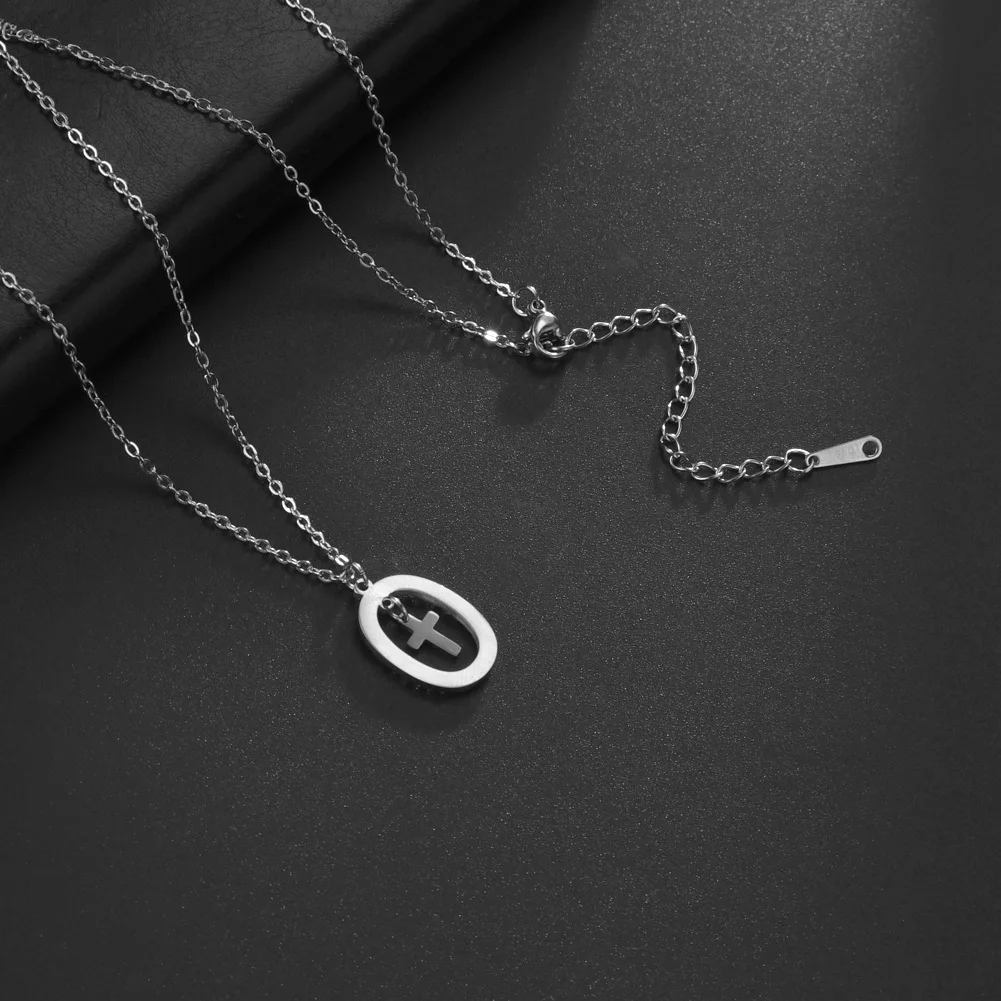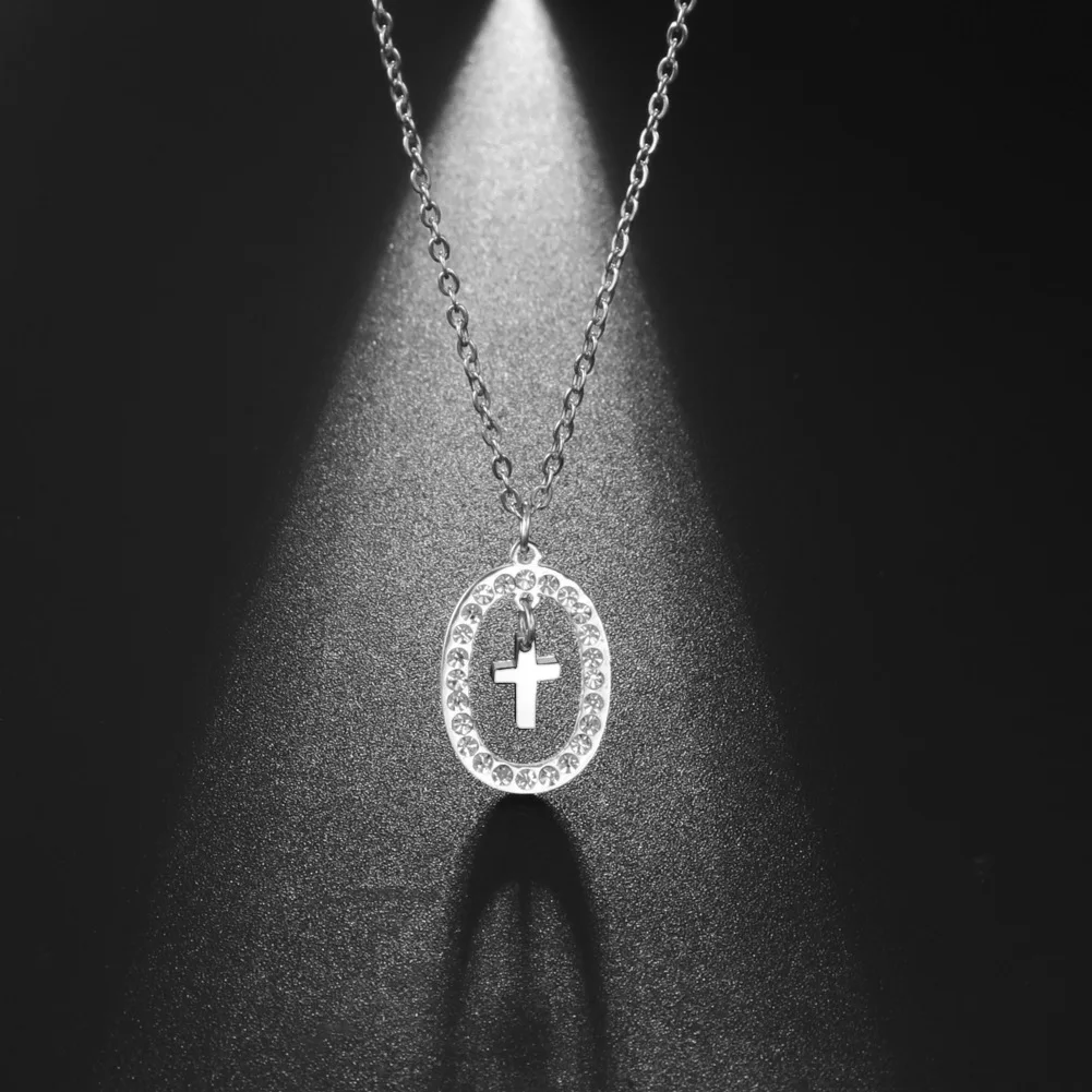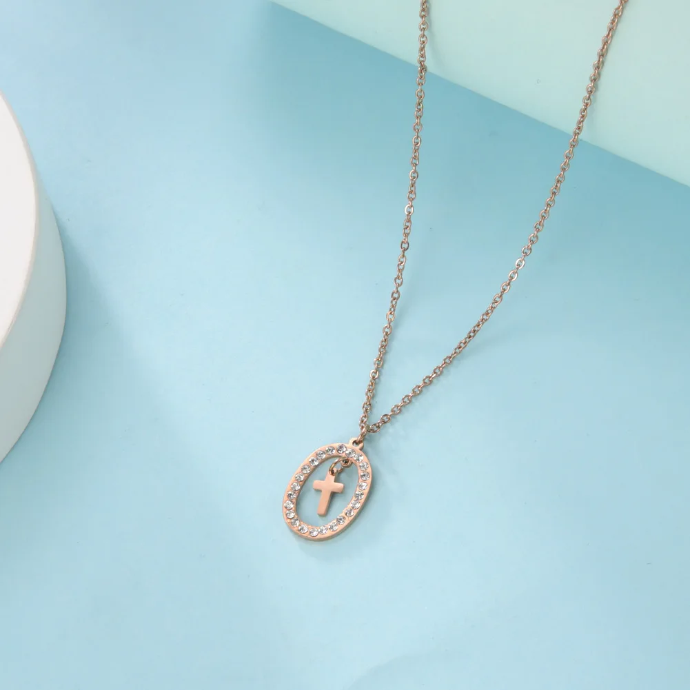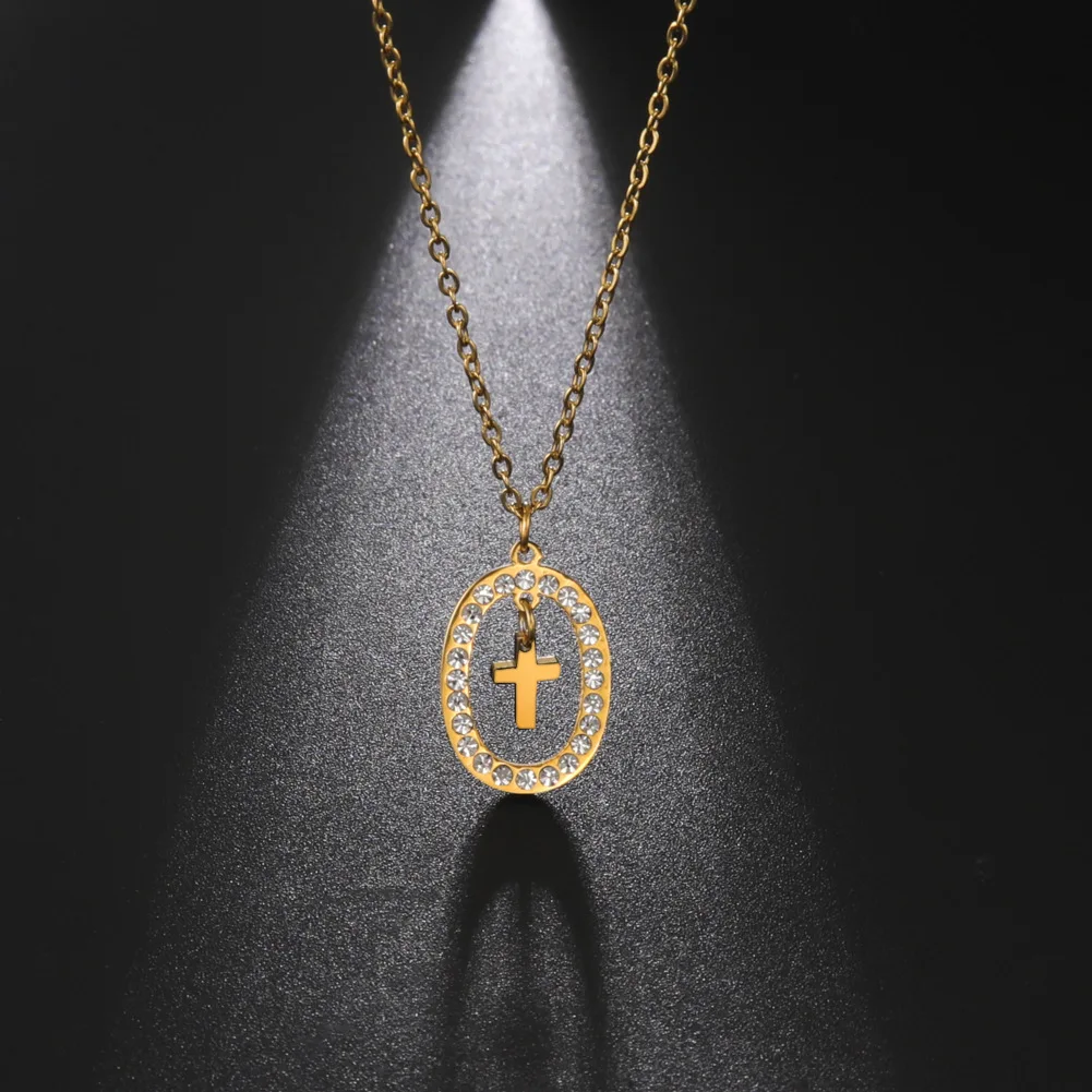 HIPEE Luxury Rhinestone Oval Pendant Necklace For Women Stainless Steel Cross Pendant Necklaces for Female Wedding Jewelry Gifts