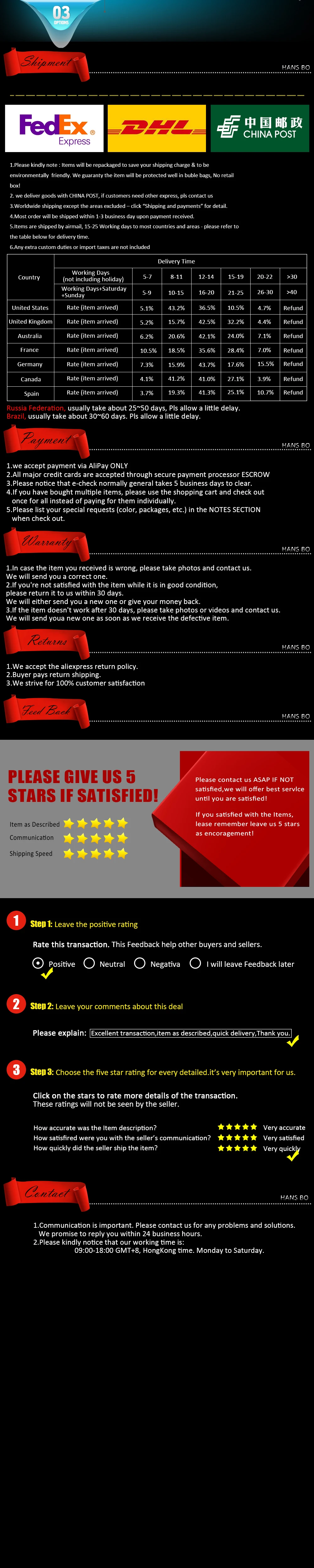 If you find this item doesn't work well when you receiving.Or still did not receive the package when the buyer protection time ended, pls let us know before you giving us a bad feedback, we will offer you satisfied solution!