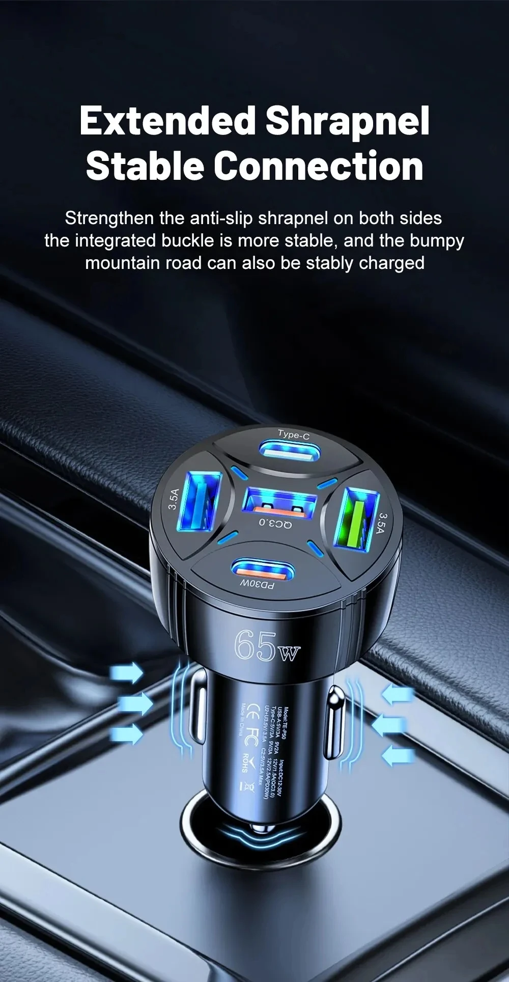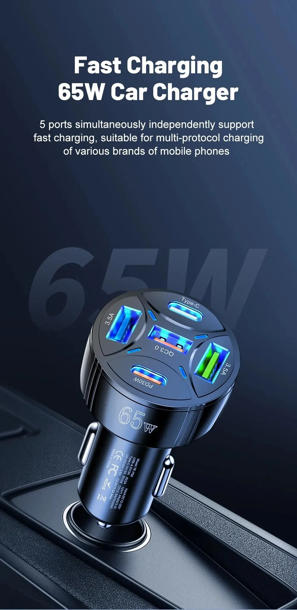 5 Port 65W USB Car Chargers Type C Car Charger Fast Charging PD QC3.0 Phone Charger in Car For iPhone Xiaomi Huawei Samsung