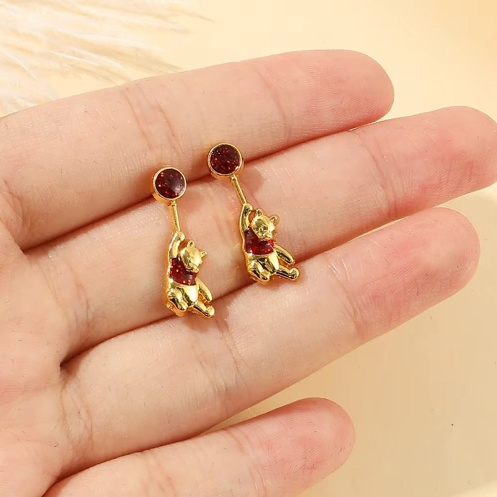 Disney Pooh Bear Rubies Ear Studs Luxury Charm Jewelry Cartoon Winnie the Pooh Earrings Accessories for Women High Quality Gift