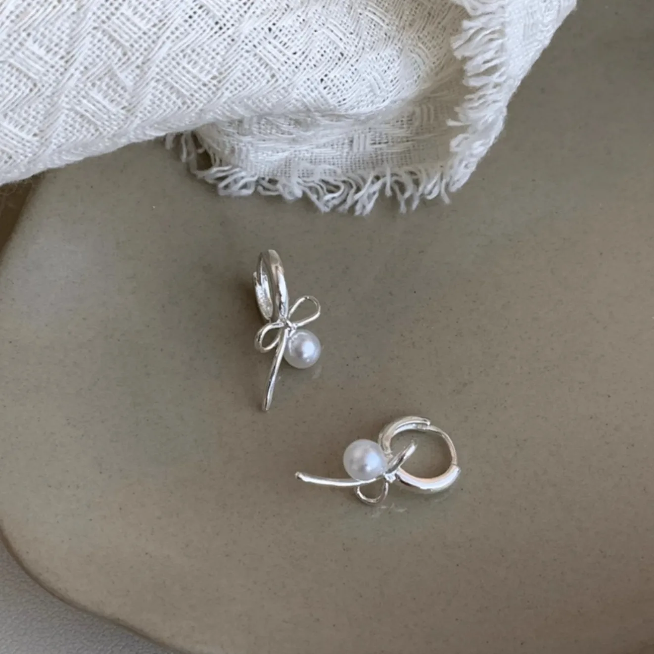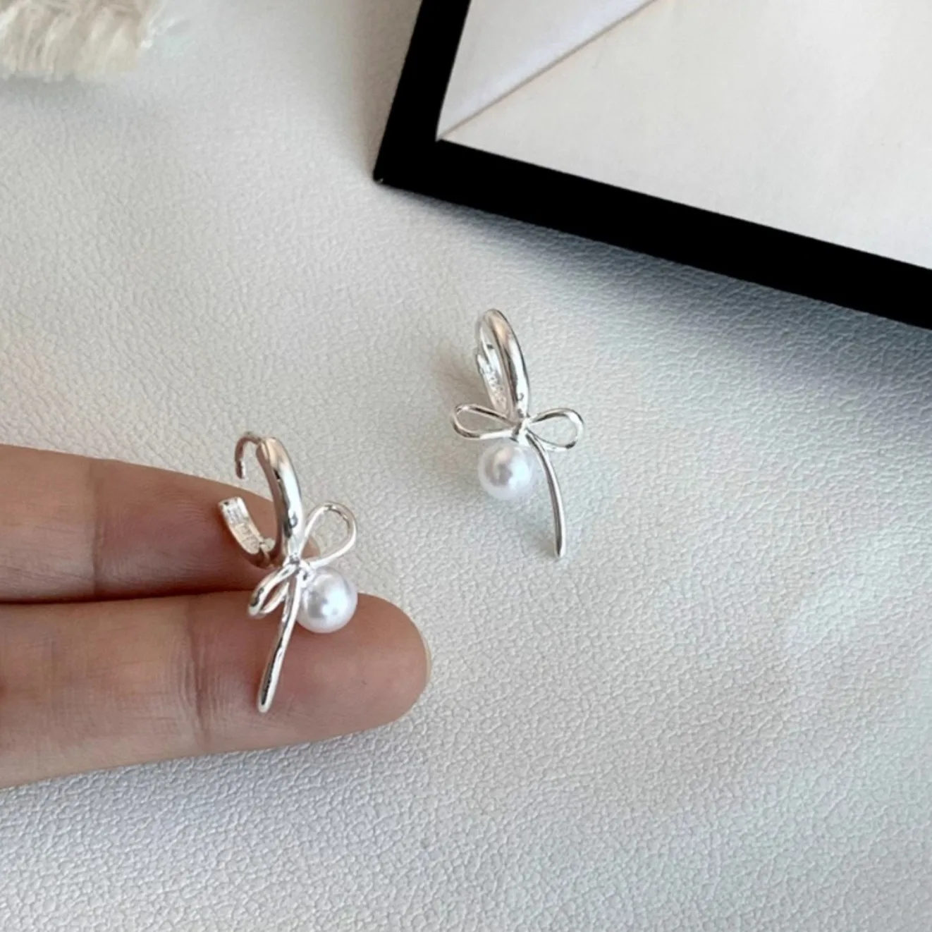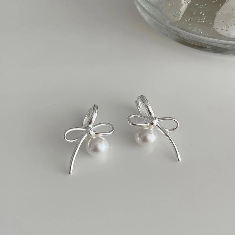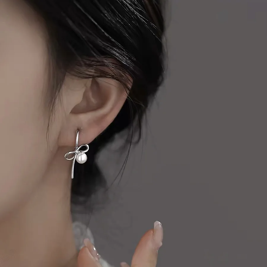 French Sweet Bowknot Pearl Pendant Hoop Earrings For Women Silver Color Elegant Ear Buckle Bithday Party Jewelry Accessories