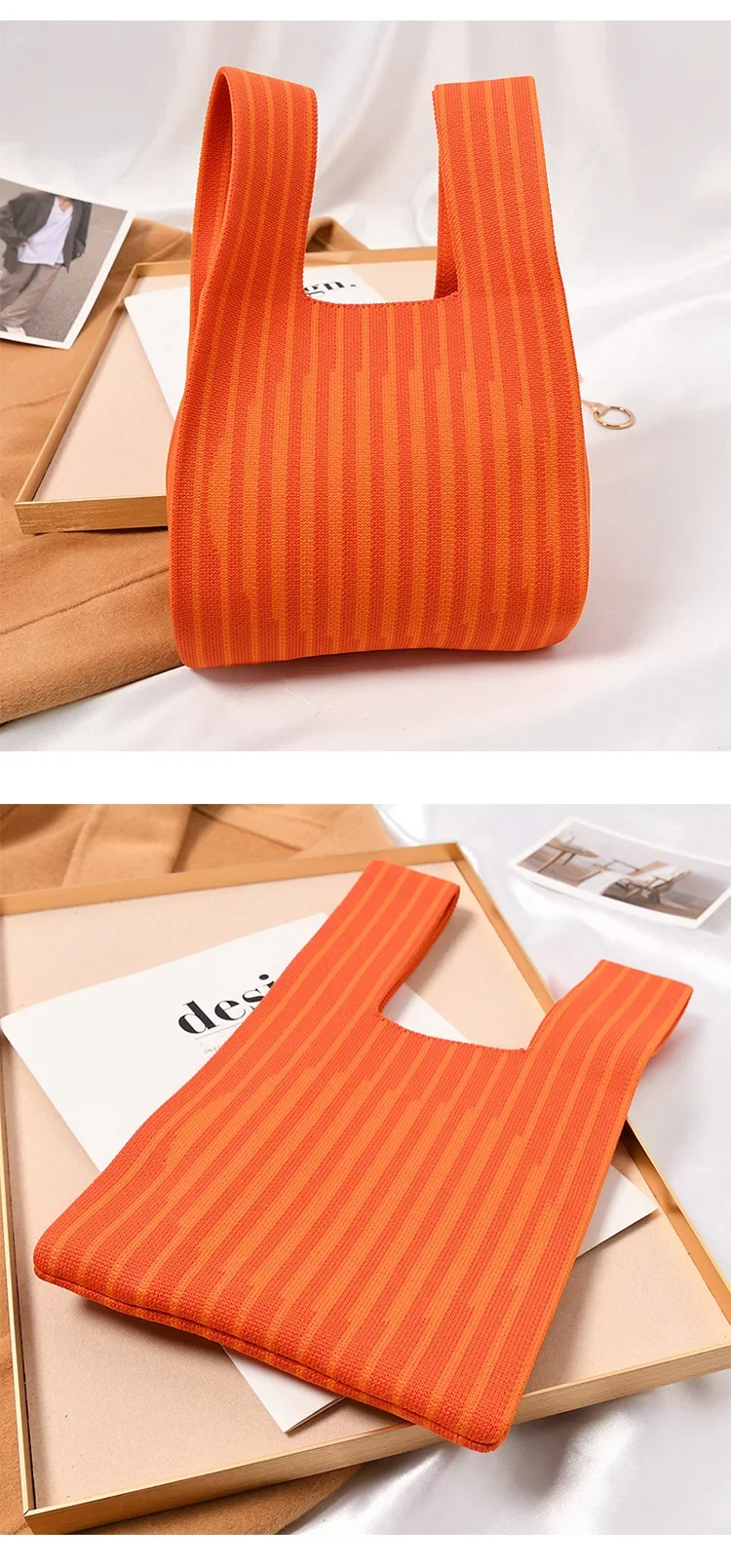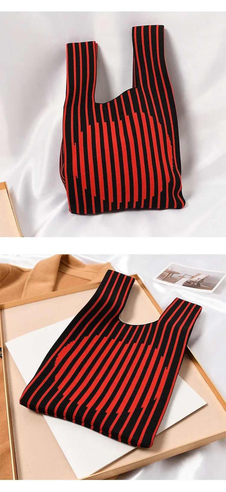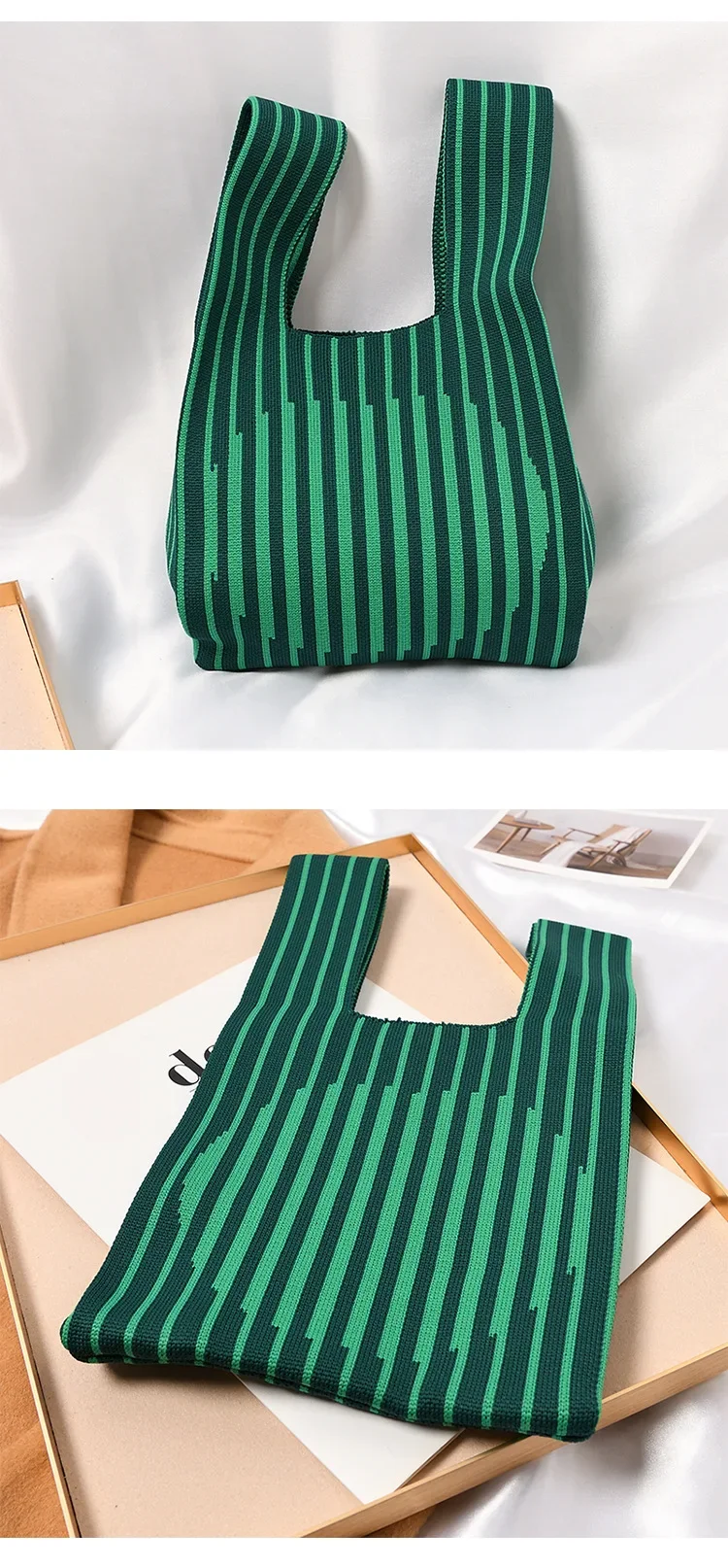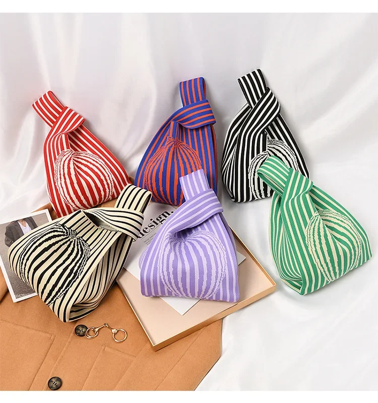 Handmade Knit Handbag Women Mini Knot Wrist Bag Korea Casual Color Wide Stripe Plaid Tote Bag Student Reusable Shopping Bags