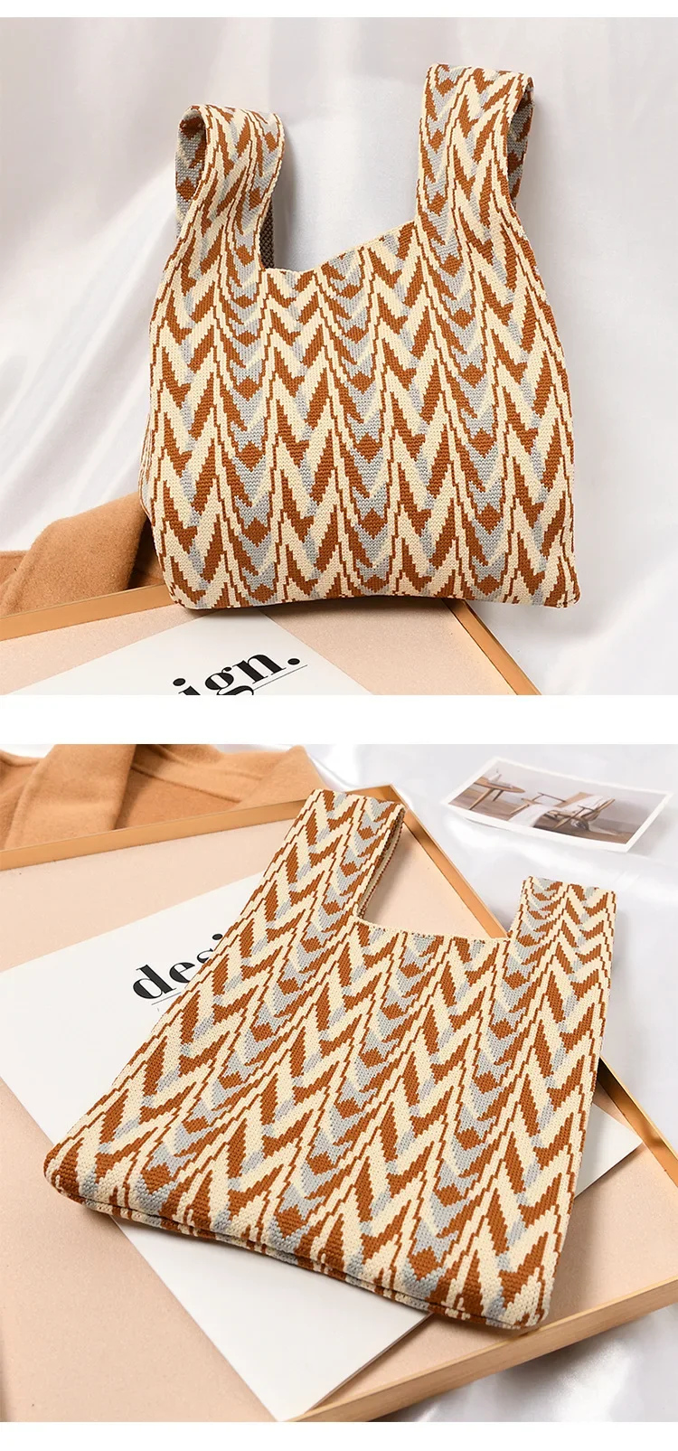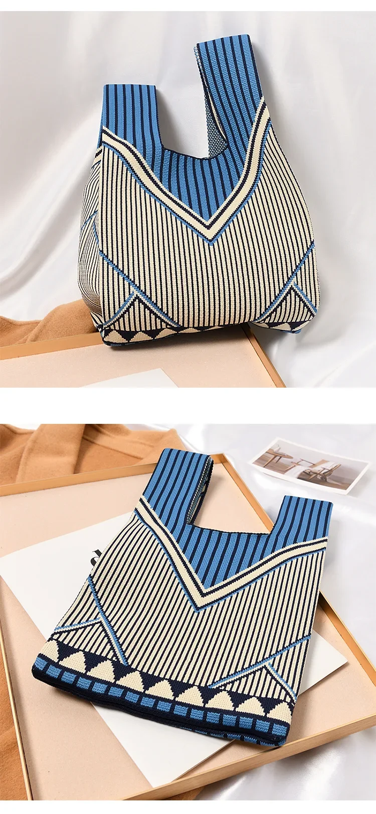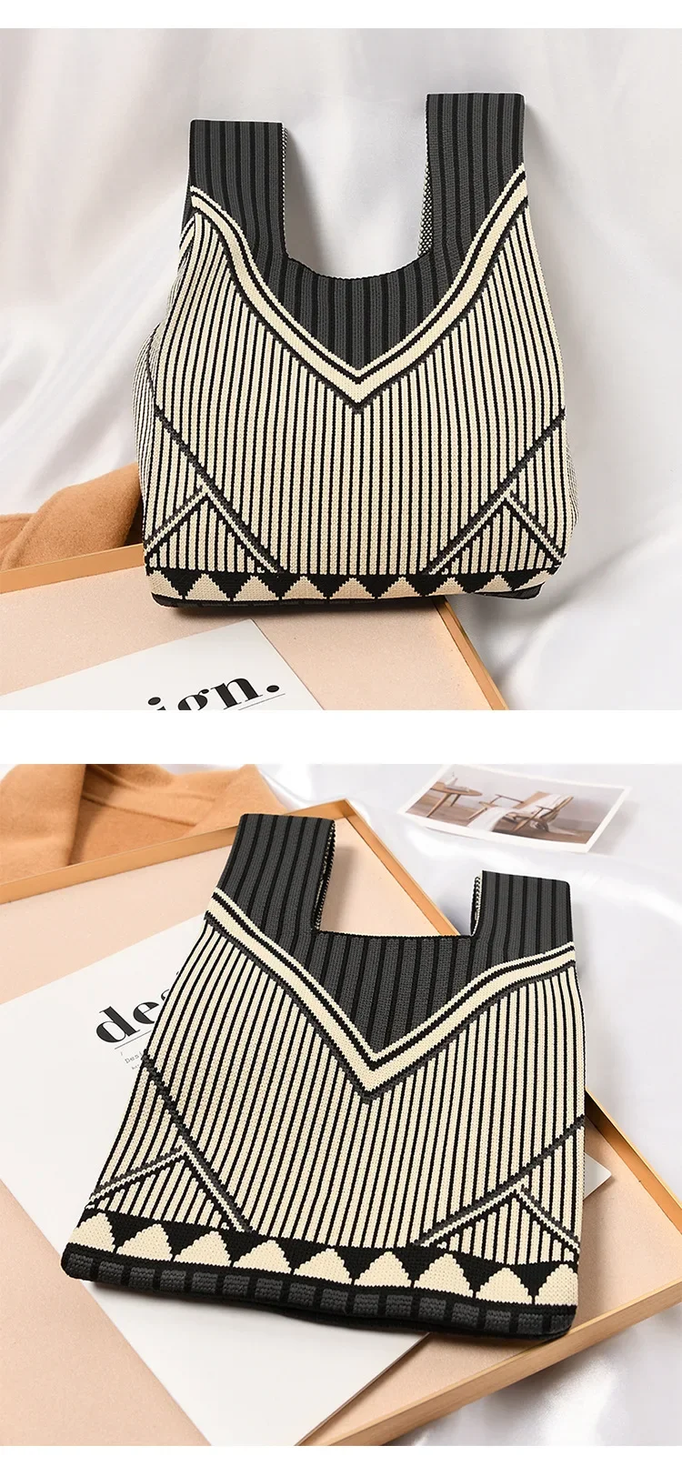 Handmade Knit Handbag Women Mini Knot Wrist Bag Korea Casual Color Wide Stripe Plaid Tote Bag Student Reusable Shopping Bags