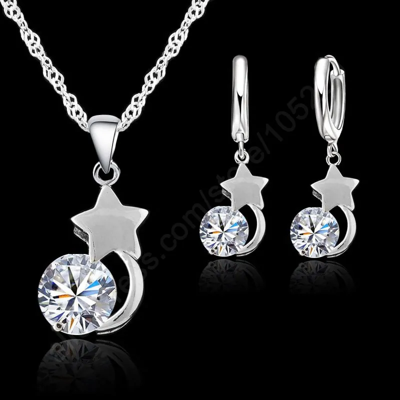 Jewelry Sets Genuine 925 Sterling Silver Needle Cubic Zirconia Crystal Stars Moon Pendant Necklaces Leverback Ear Earring