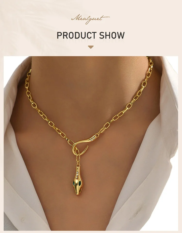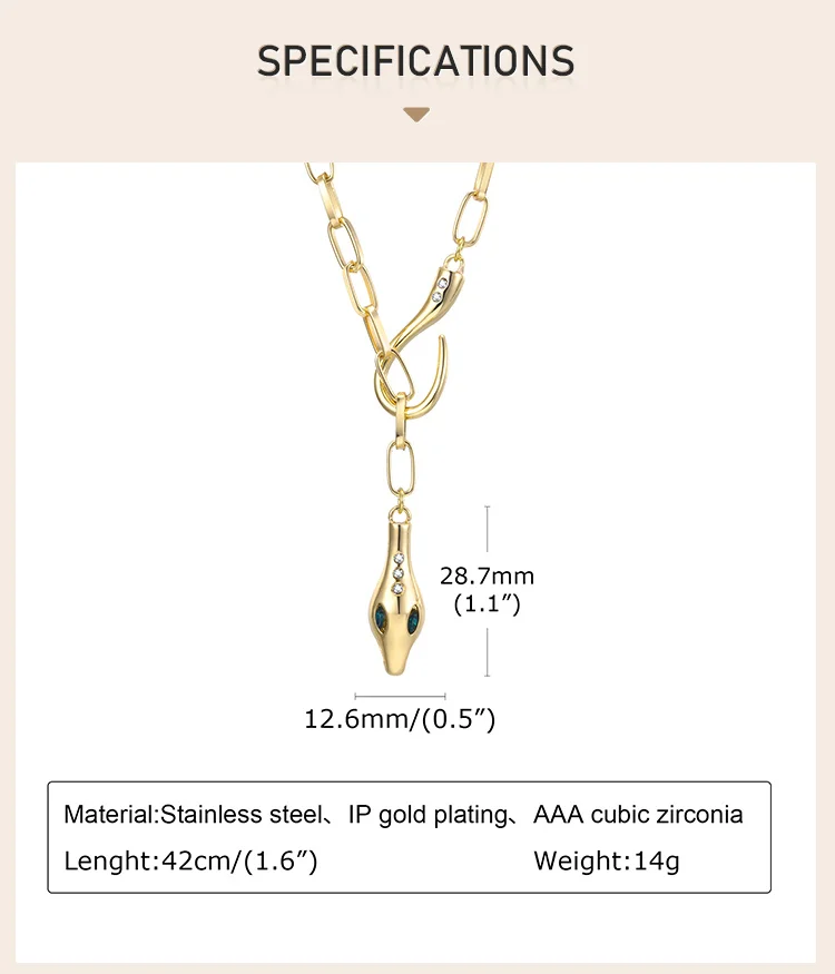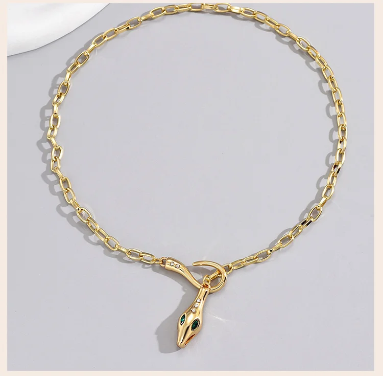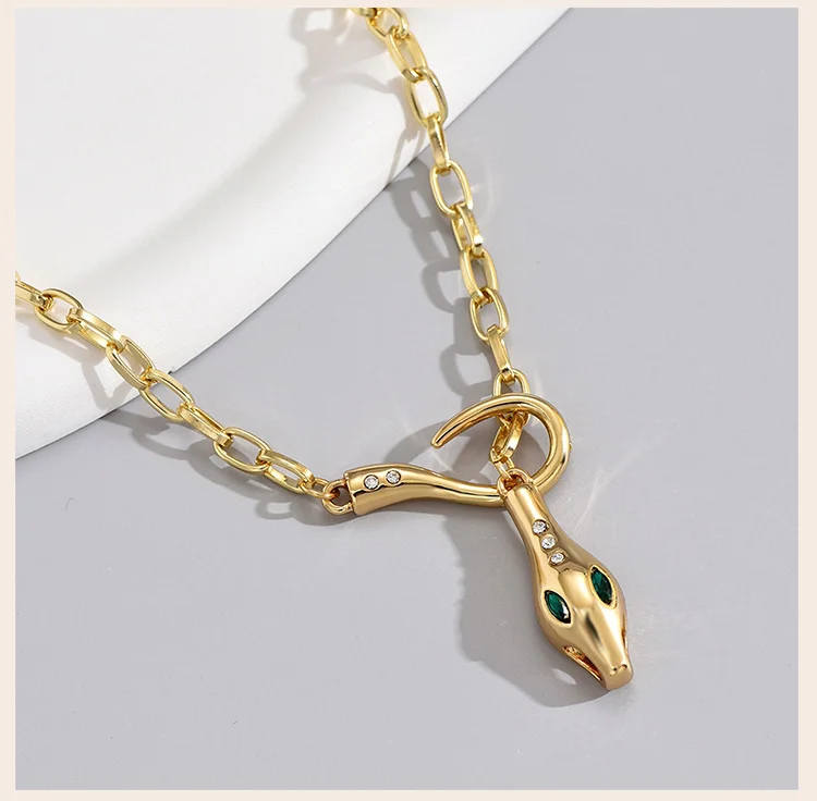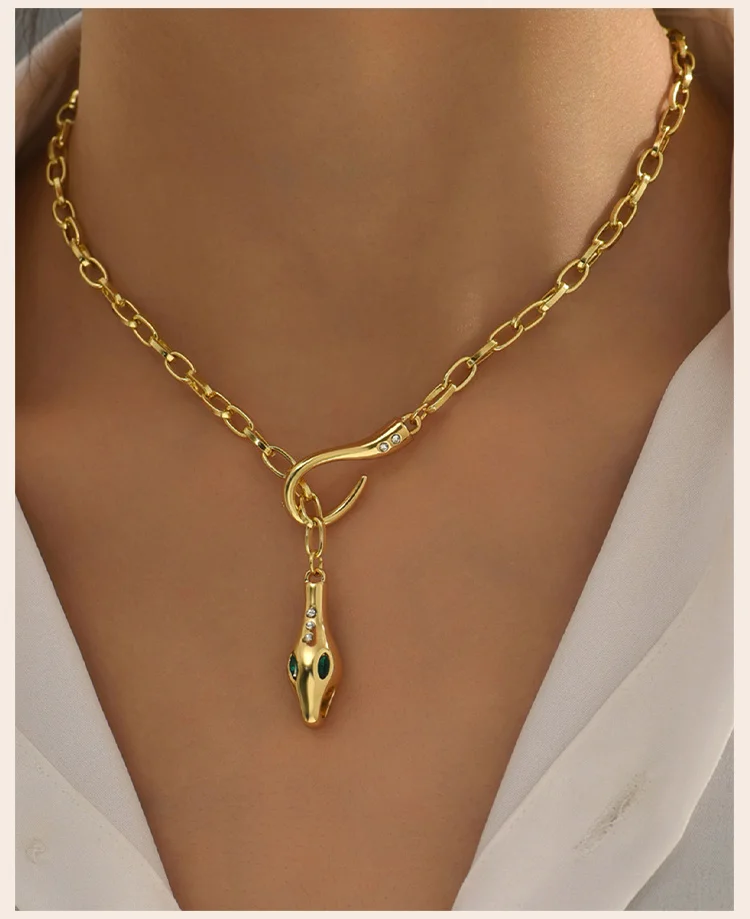 Statement Zirconia Snake Design Women's Pendant Necklace Stainles Steel Gold Plated Paperclip Chain Jewelry